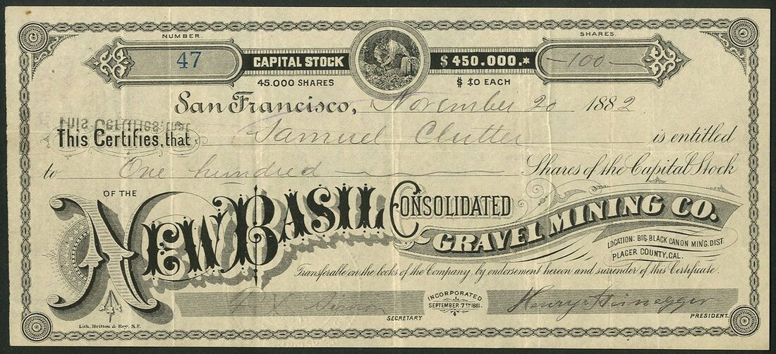 U.S.A: New Basil Consolidated Gravel Mining Co., $10 shares, 188[2], #47, small vignette of miner, black printing on yellowish paper. Incorporated 7th September 1881. Property in the Big Black Canon Mining District, Placer County, California. VF.