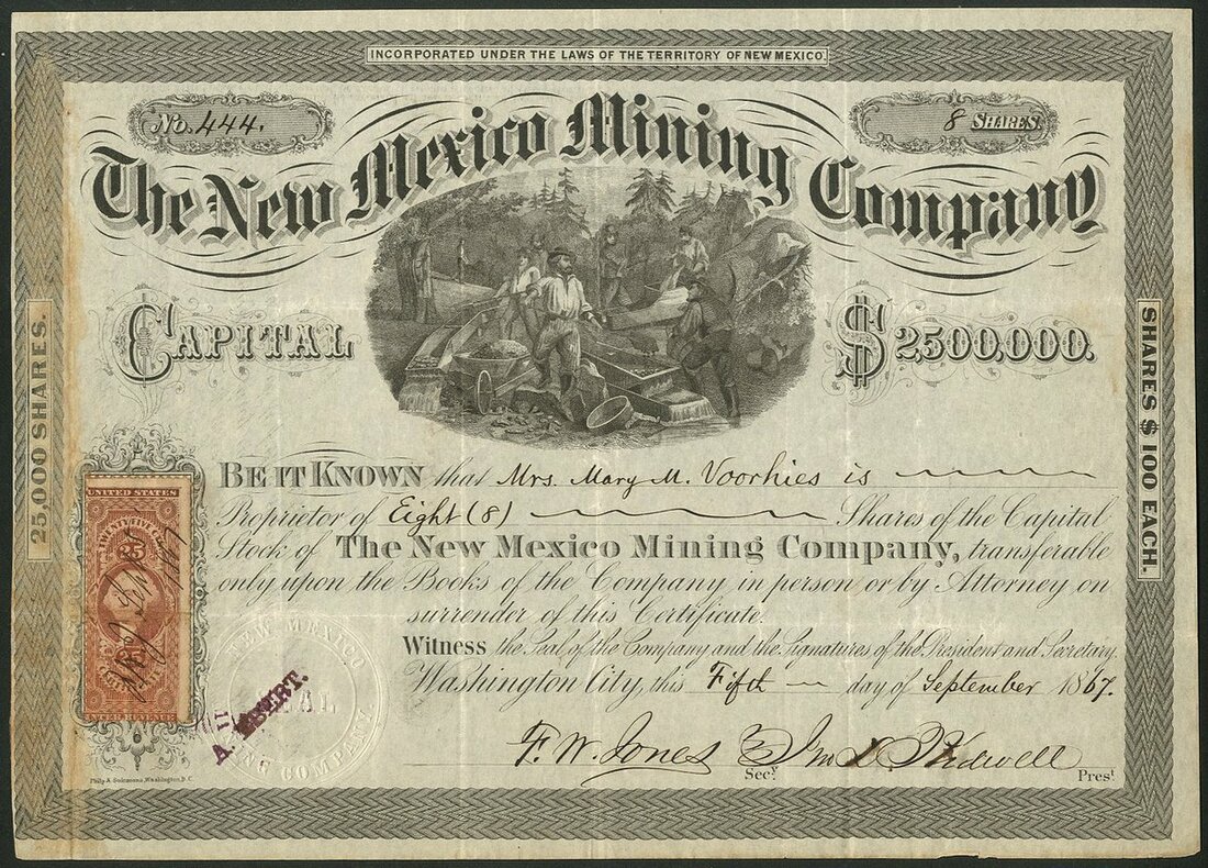 U.S.A: New Mexico Mining Co., $100 shares, 18[67], #444, vignette of miners sifting ore, black. Gold mines at Ortiz, 27 miles from Santa Fe, New Mexico. Cancelled. Adhesive residue at left, AVF.