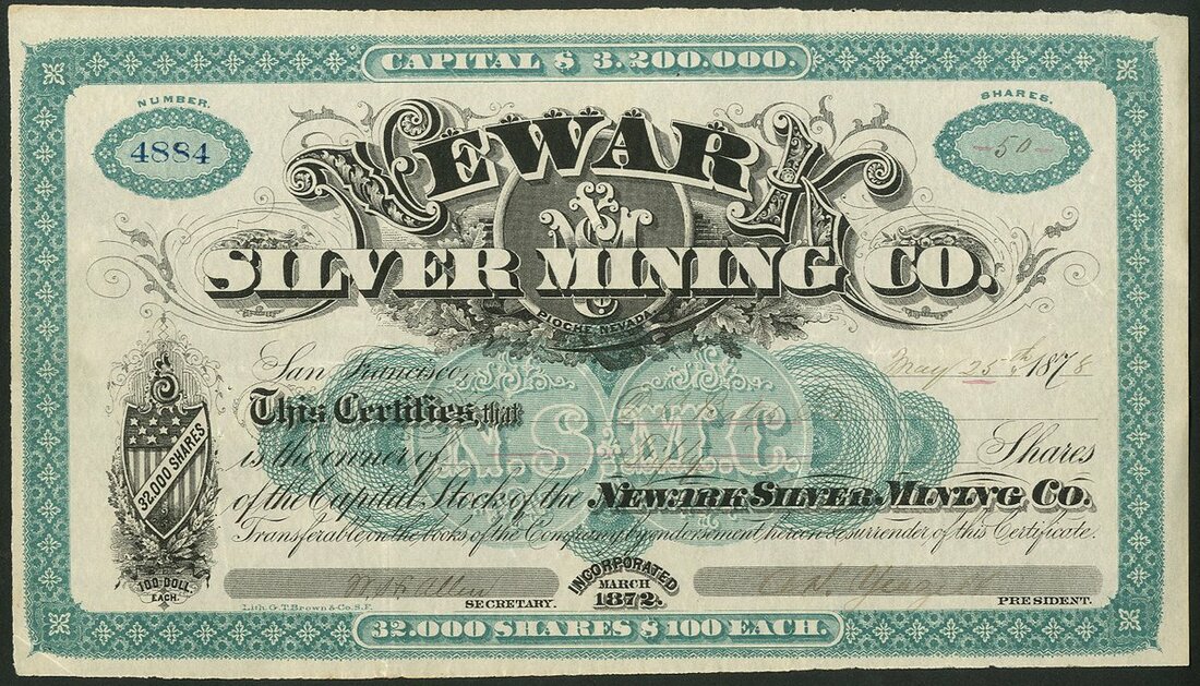 U.S.A: Newark Silver Mining Co., $100 shares, 187[8], #4884, decorative black and green printing. Incorporated in California in March 1872. Mines in the Ely District, between Ely and Pioche, Nevada. GVF.
