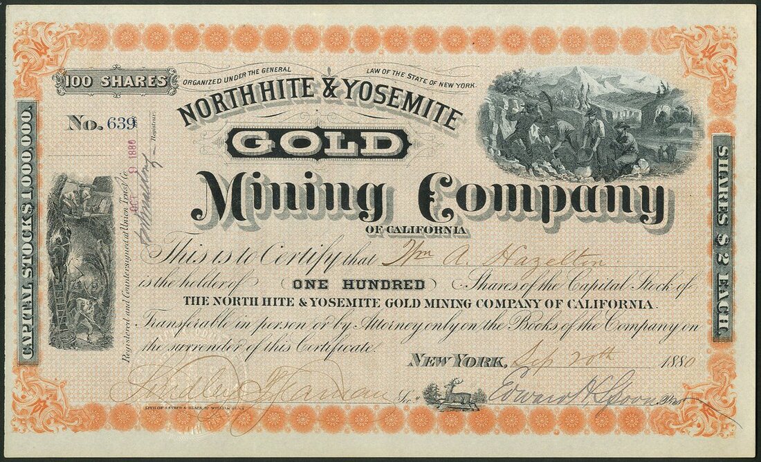 U.S.A.: North Hite & Yosemite Gold Mining Company of California, 100 shares of $2, New York 188[0], #639, mine shaft at left, miners above ground top right, orange and black. Mariposa County, California. EF.