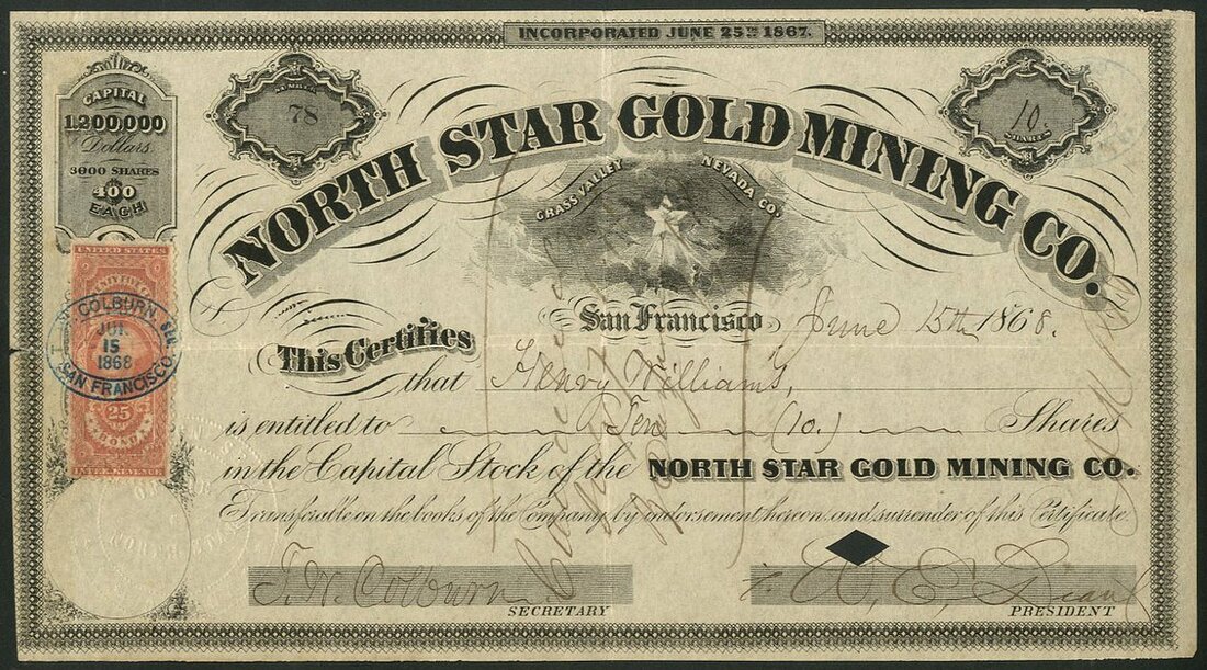 U.S.A.: North Star Gold Mining Company, $400 shares, San Fransisco 186[8], #78, 'North star' in centre, black, adhesive revenue stamp, cancelled. Incorporated in 1867 to acquire the property in the Grass Valley District, Nevada County, California. Shut down in 1875 and another company acquired the property in 1884. VF.