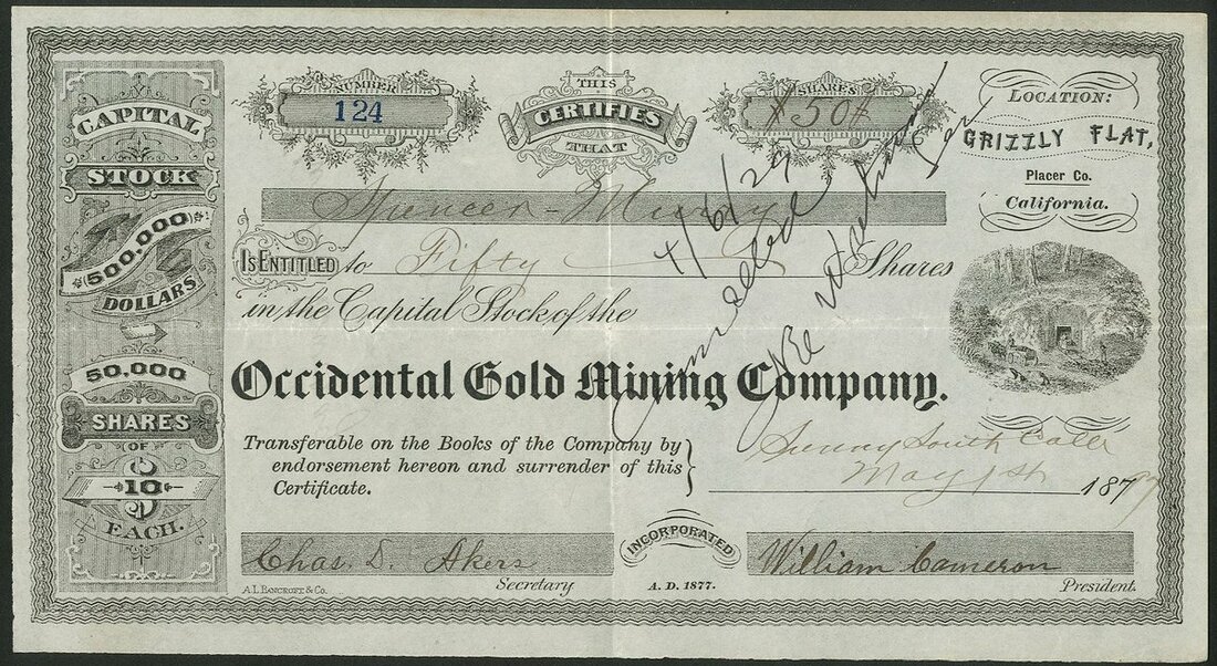 U.S.A.: Occidental Gold Mining Company, $10 shares, 187[97], #124, mine tunnel entrance at right, black. Cancelled in 1929! Incorporated in California in 1877. Mines at Grizzly Flat, Placer County, California. VF.