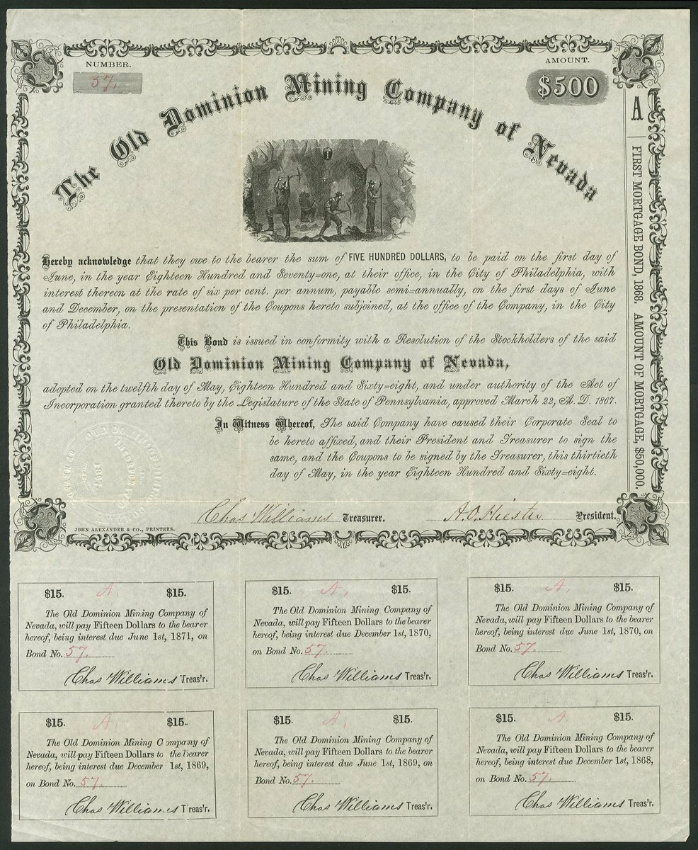 U.S.A.: Old Dominion Mining Company of Nevada, 6% bond for $500, 1868, #57, miners underground, black, with coupons. A Philadelphia company owning 2 mines and a quartz mill in the Hot Creek District of Nevada. VF and scarce.