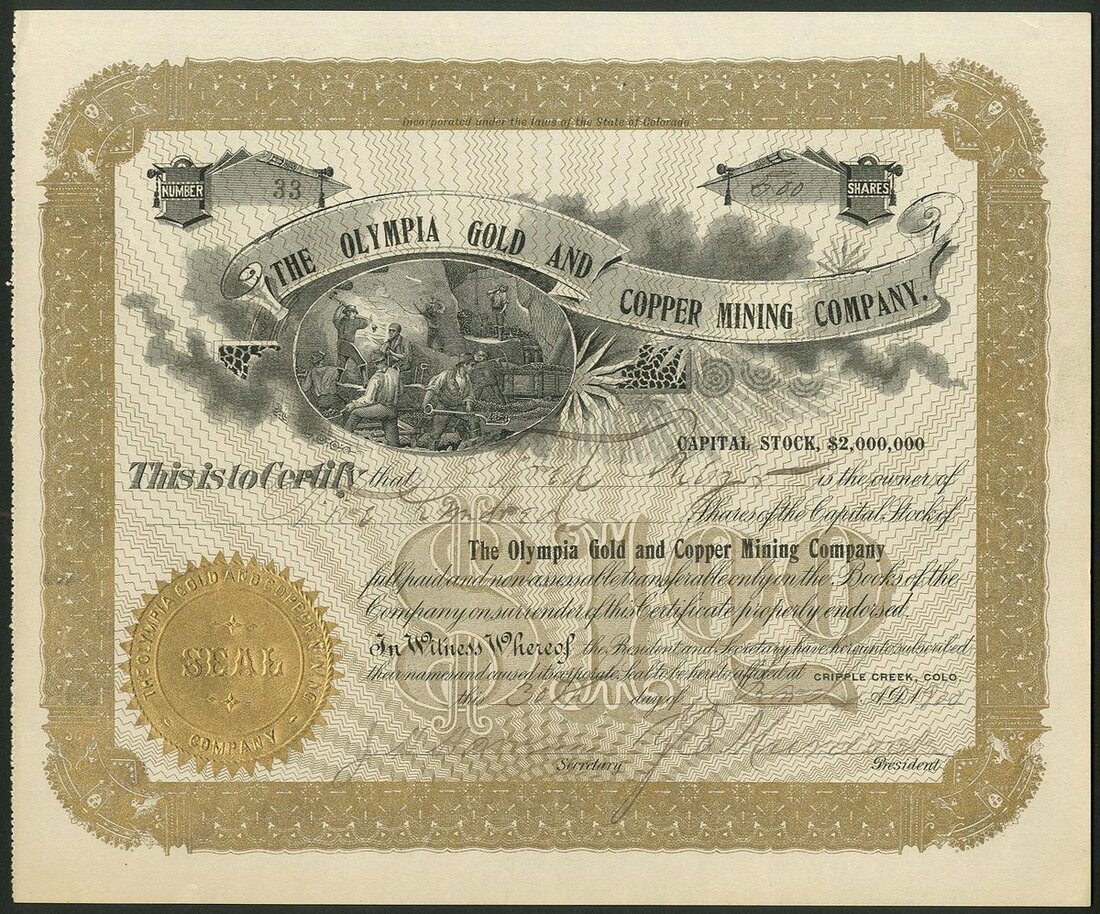 U.S.A: Olympia Gold and Copper Mining Co., $1 shares, 1[900], #33, miners at work below title, ornate border, black and gold. Property in the Cripple Creek district, El Paso County, Colorado. EF.