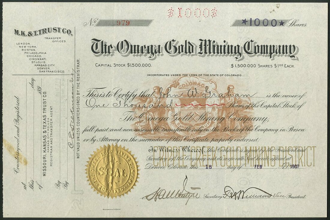 U.S.A: Omega Gold Mining Co., $1 shares, 189[1901], #979, black with Colorado state seal in brown underprint, gold seal. Mines in the Cripple Creek District, Colorado. AEF.