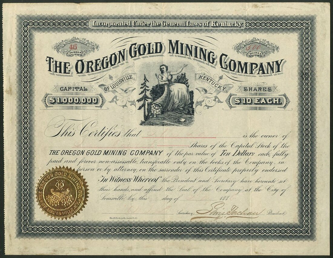 U.S.A.: Oregon Gold Mining Company, $10 shares, 188[6], #46, female holds cornucopia in centre, black. A Kentucky corporation formed in 1884 to acquire the Whitman and Alta mines and the town of Cornucopia in Oregon. In receivership by 1893. VF and scarce.