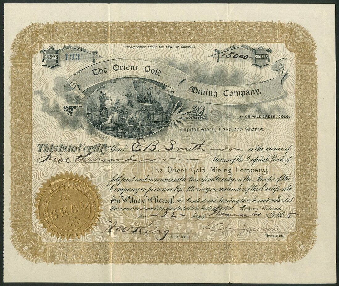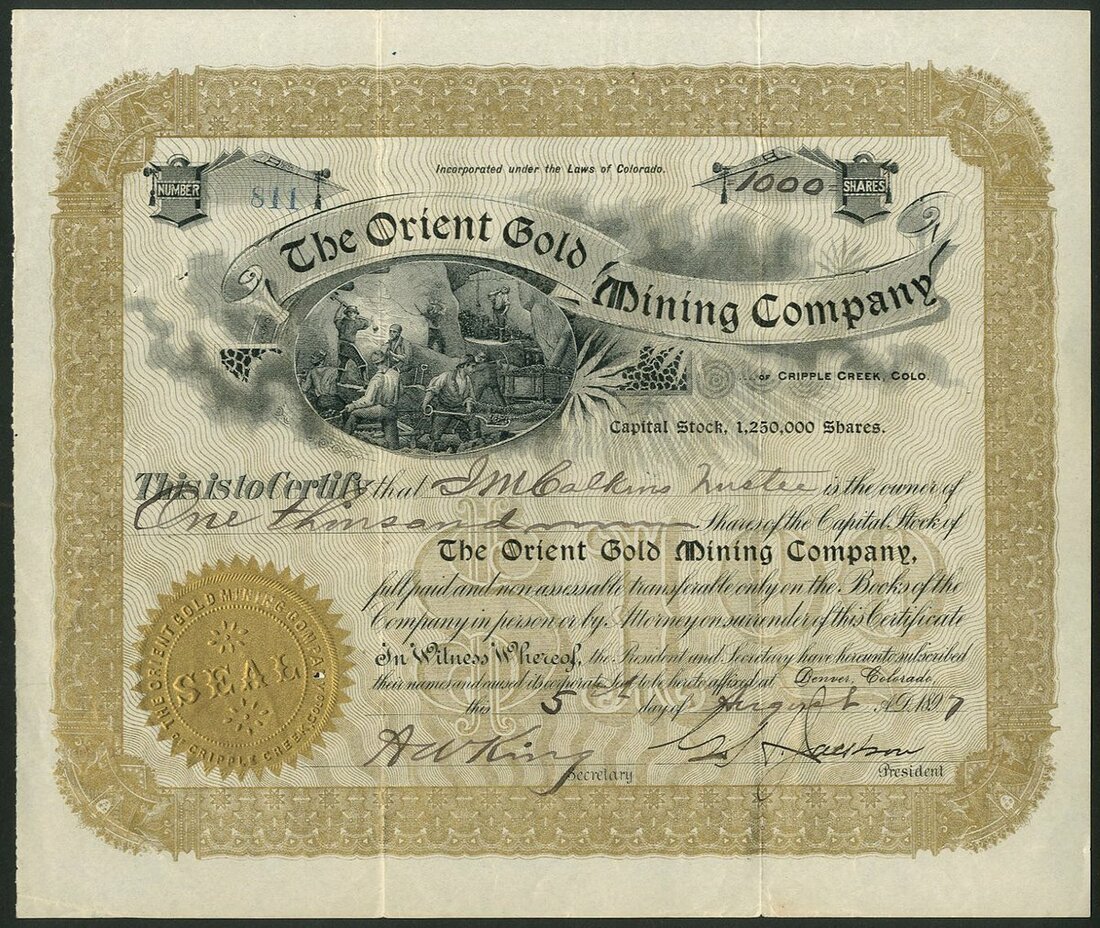 U.S.A.: Orient Gold Mining Company, pair of certificates for $1 shares, 189[5], #193 and 189[7], #811, different text settings, gold and black, miners in centre. Mines in Cripple Creek, Colorado. GVF (2).