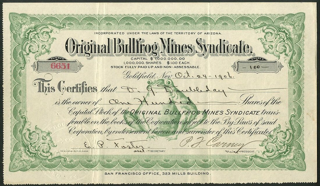 U.S.A.: Original Bullfrog Mines Syndicate, $1 shares, Goldfield [1906], #6651, green and black with large underprint of bullfrog. Incorporated in the territory of Arizona working mines in the Bullfrog District, Nevada. VF.