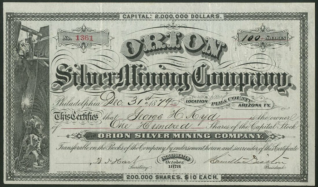 U.S.A.: Orion Silver Mining Company, $10 shares, 18[79], #1361, mine shaft at left, black. Incorporated in October 1878 owning mines in Pima County, Arizona Territory. VF.
