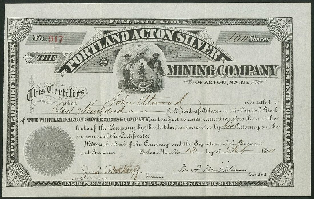 U.S.A: Portland Acton Silver Mining Co., of Acton, Maine, $1 shares, 188[0], #917, decorative black printing. Incorporated in Maine in December 1879. Mines at Acton, Maine. VF.