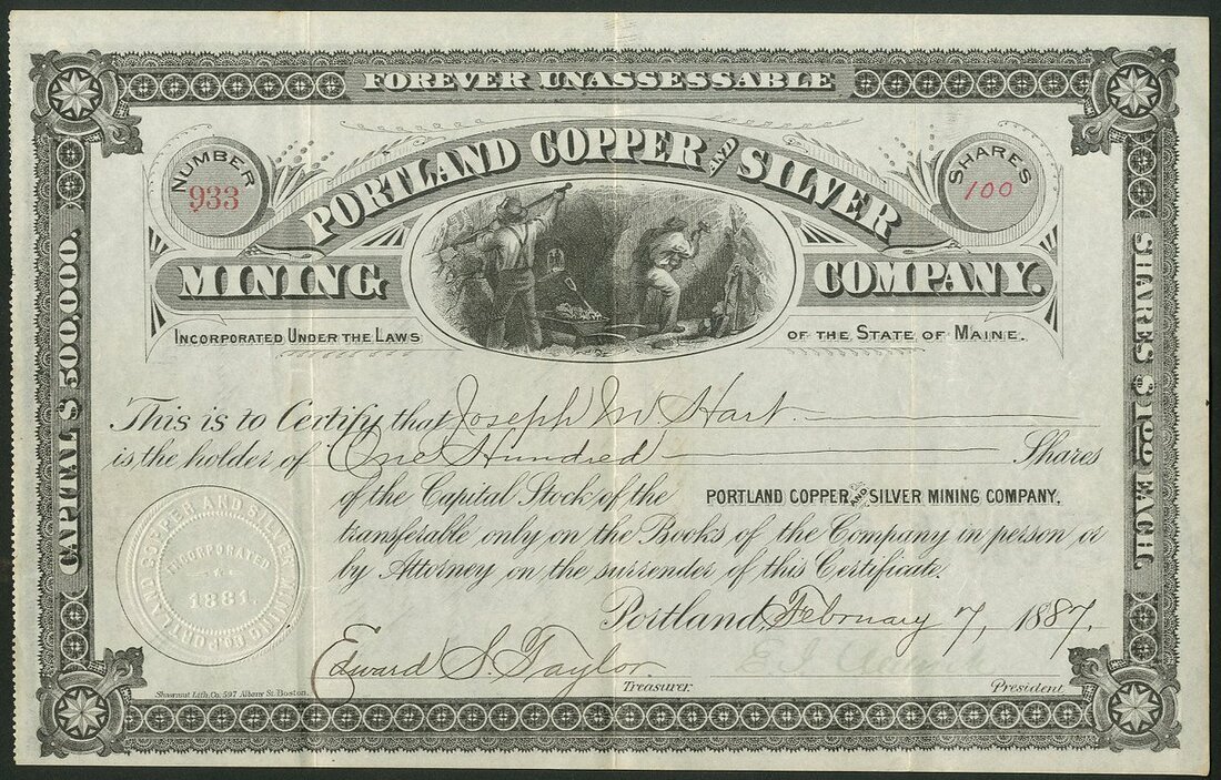 U.S.A: Portland Copper and Silver Mining Co., $1 shares, Portland 18[87], #933, vignette of miners, ornate border, black. Incorporated in Maine in 1881. VF.