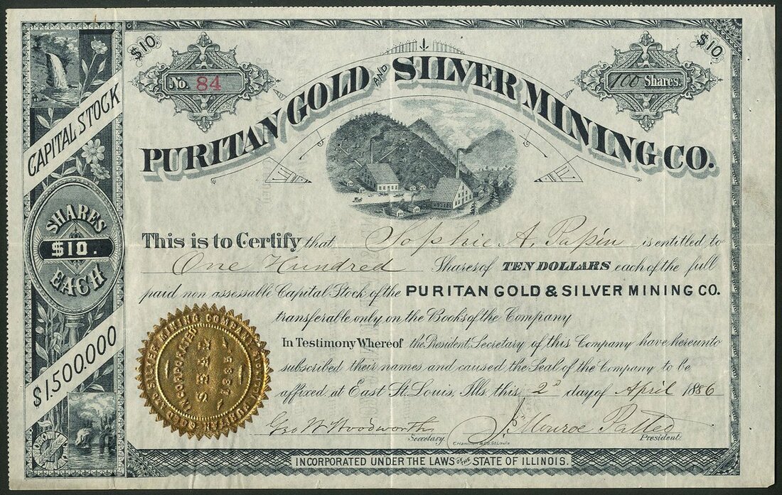 U.S.A.: Puritan Gold and Silver Mining Company, $10 shares, 18[86], #84, Mining Camp in centre, black, gold seal. Incorporated in Illinois to acquire mines near Georgetown, Colorado. VF and scarce.