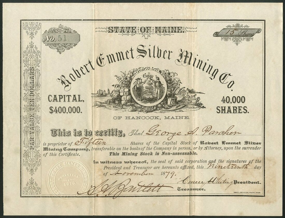 U.S.A: Robert Emmet Silver Mining Co., $10 shares, 18[79], #51, arms in centre, decorative black printing. Incorporated in Maine in 1879. Mines opened during the silver boom at Hancock, Maine. Light staining, VF.
