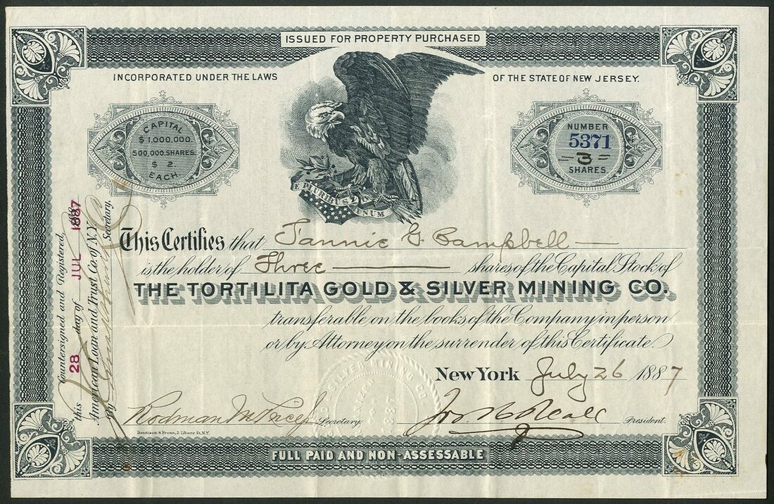 U.S.A.: Tortilita Gold & Silver Mining Company, $2 shares, New York 188[7], #5371, eagle in centre, black. Incorporated in New Jersey in 1887 to acquire 12 mines in Arizona. The only information available appears to be accusation that the company was a stock selling operation as well as numerous ads for the sale of stock placed by the President Jos. H. Reall. All mention had dissapeared by late 1888. GVF and rare.