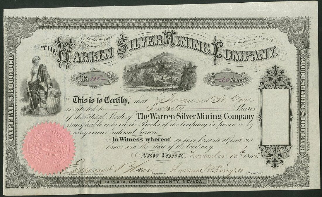 U.S.A: Warren Silver Mining Co., $100 shares, New York 186[5], #118, decorative title and border with vignette, pink seal. Incorporated in New York 11th October 1865 to acquire property at La Plata, Churchill County, Nevada. EF.