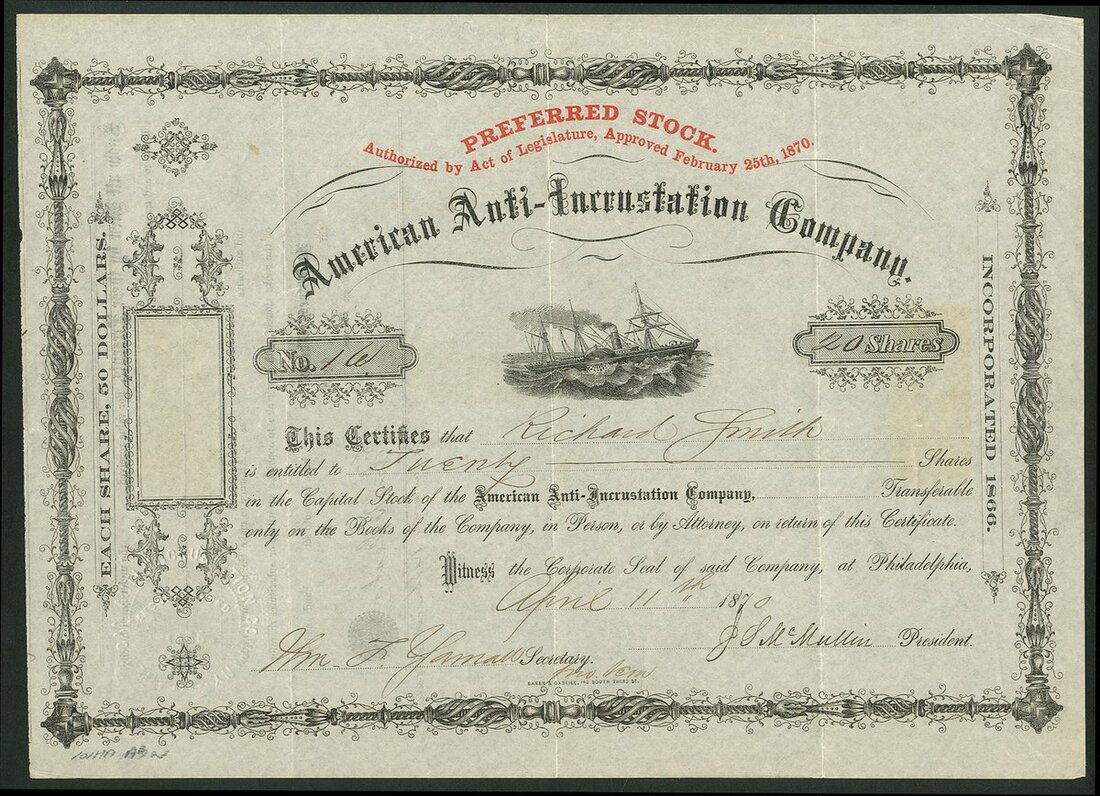 U.S.A.: American Anti-Incrustation Company, PA, $50 preferred shares, 187[0], #16, paddle steamer in centre, black and red, adhesive stamp at left is missing. Incorporated in 1866 to work a device for removing scale from steam boilers, not just in steamships but also railroad engines. The Pennsylvania Railroad Company contracted with the company to use the device on all their locomotives in 1866. AVF.
