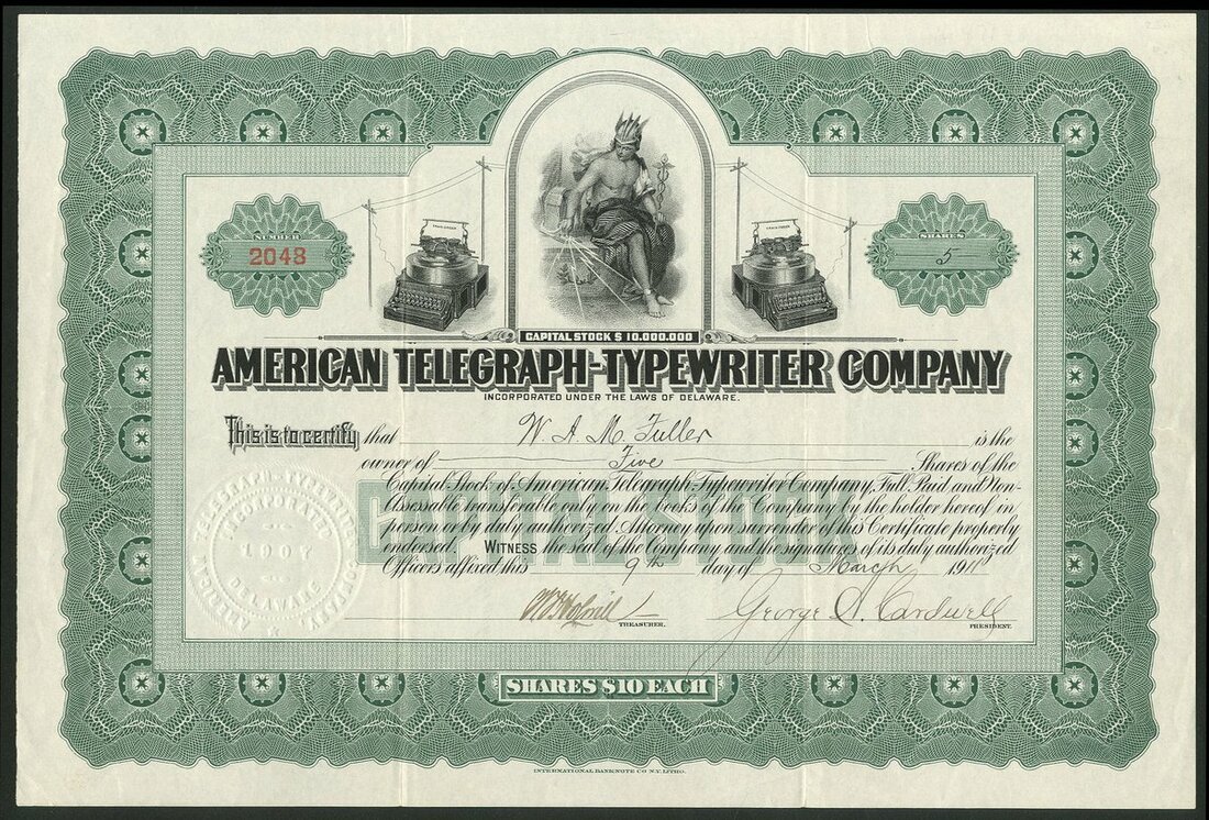U.S.A.: American Telegraph-Typewriter Company, DE, $10 shares, 19[11], #2048, signed by George A. Cardwell as President, allegorical figure with teletype machines, green and black. Founded by Cardwell in 1907 with a factory in Brooklyn. His company installed the first automatic stock quotation system in the NY Stock Exchange. GVF.