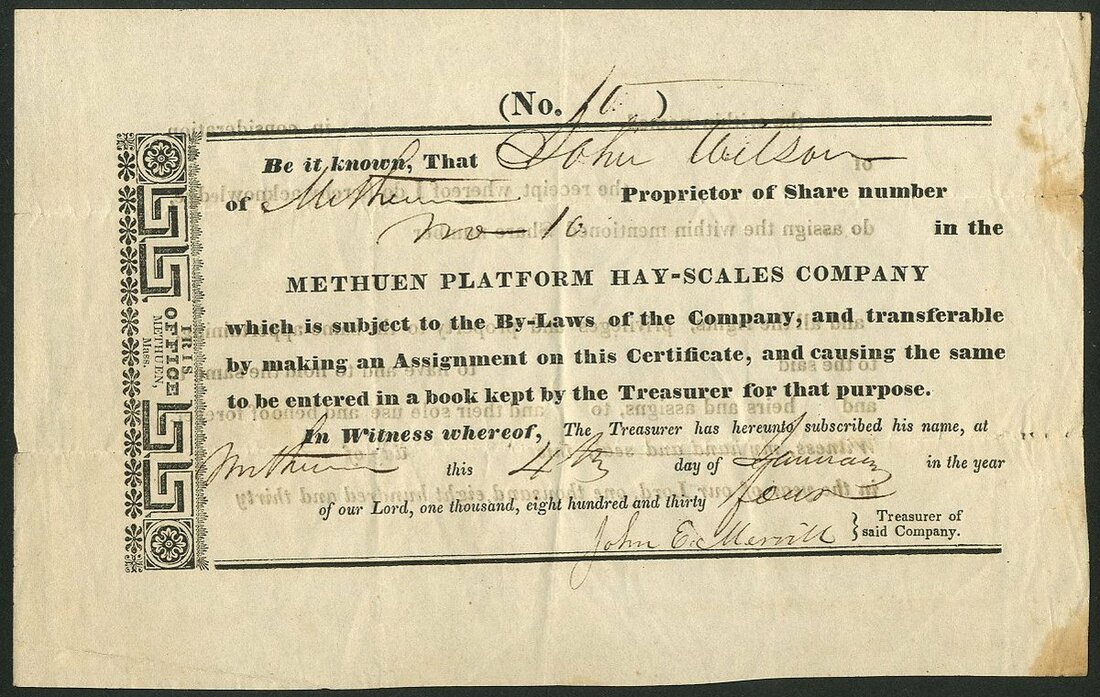 U.S.A.: Methuen Platform Hay-Scales Company, Massachusetts, one share, 183[4], #10, small format with scrollwork at left, black. We assume the company, based in Methuen, Massachusetts, operated large scale for weighing hay carts. Uneven edges otherwise VF and rare.