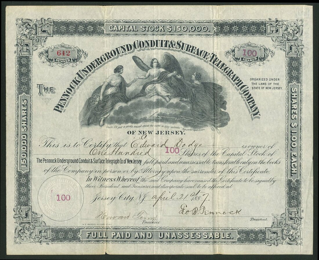U.S.A.: Pennock Underground Conduit & Surface Telegraph Company, New Jersey, $1 shares, 188[7], #642, signed by George Pennock as President, allegorical females top centre, black. Installed telegraph systems in New Jersey and New York including Brooklyn for the Fire and Police departments. AVF.