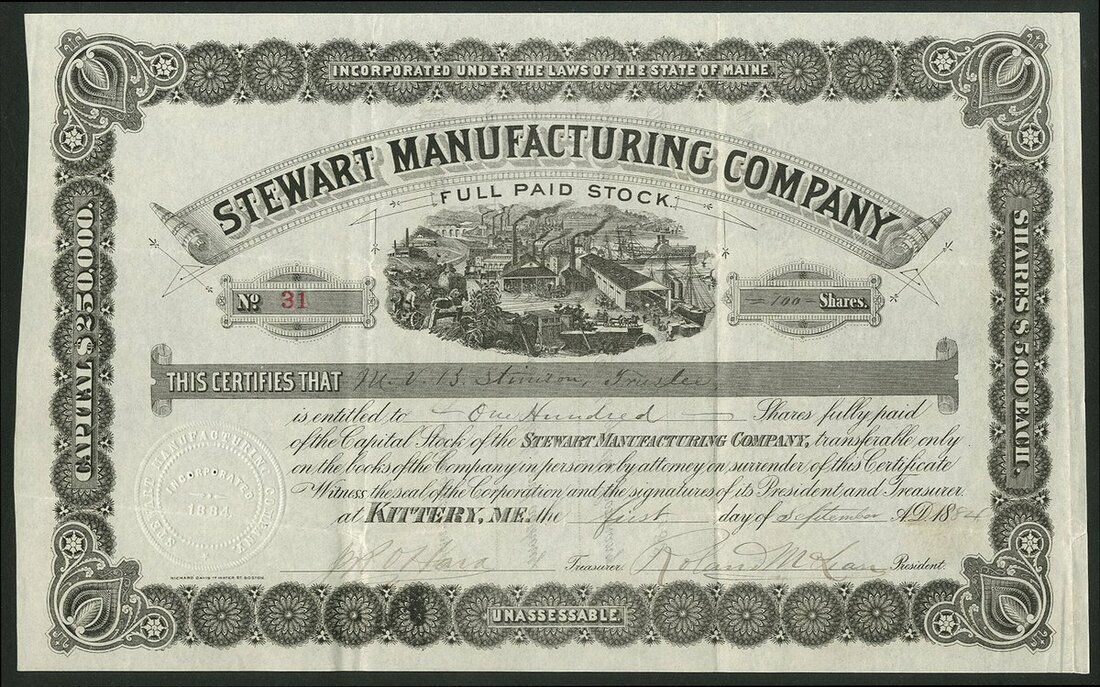 U.S.A.: Stewart Manufacturing Company, Maine, $5 shares, Kittery, Maine 18[84], #31, lovely vignette of factory, black. Incorporated in Maine 20th August 1884. No further details can be found. VF.