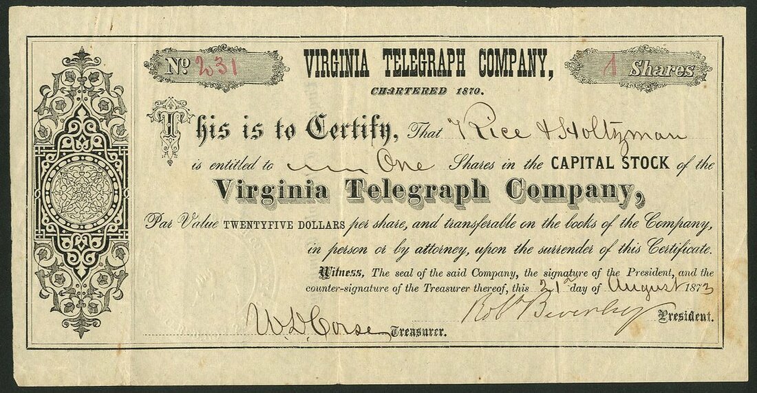 U.S.A.: Virginia Telegraph Company, $25 shares, 187[3], #231, scrollwork at left. black. A company of the same name was originally chartered in 1849, this company was chartered in 1870. Some light foxing at bottom right, VF.