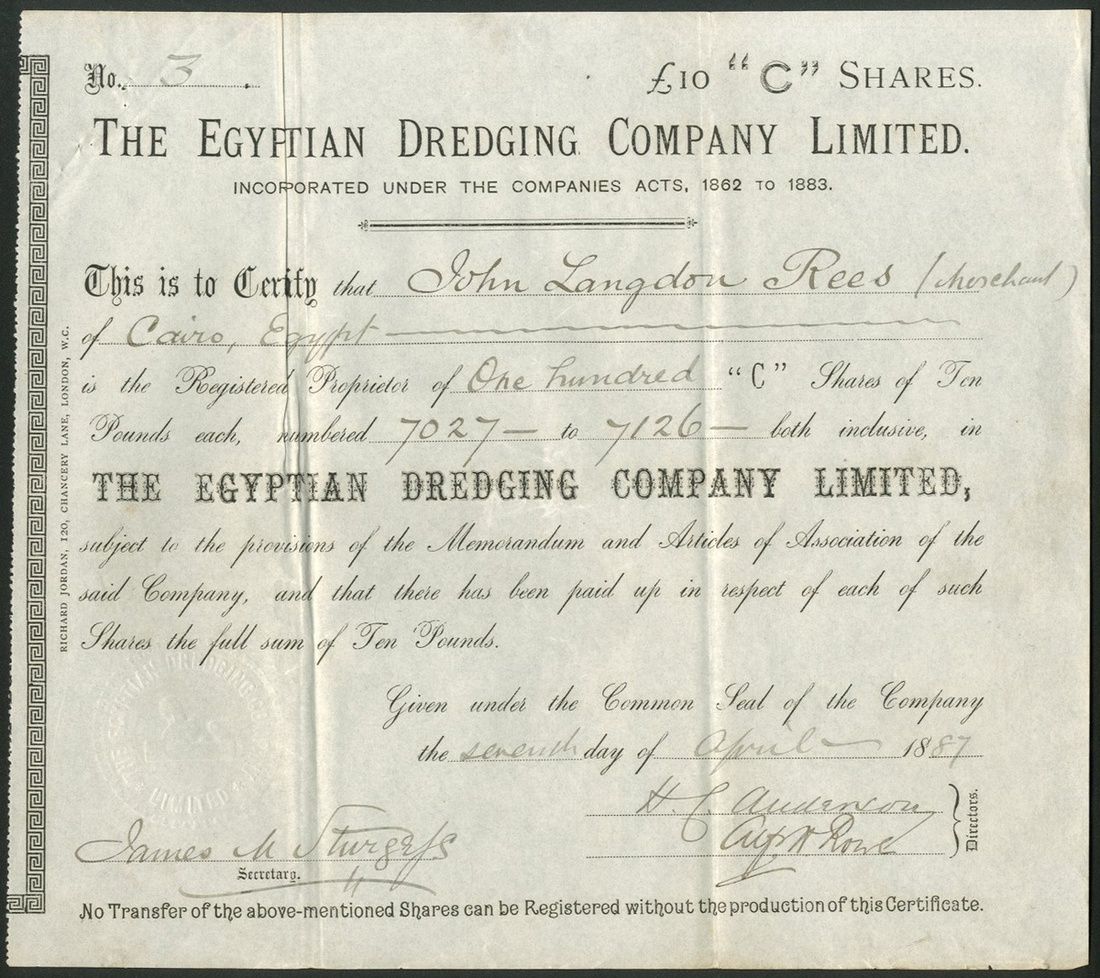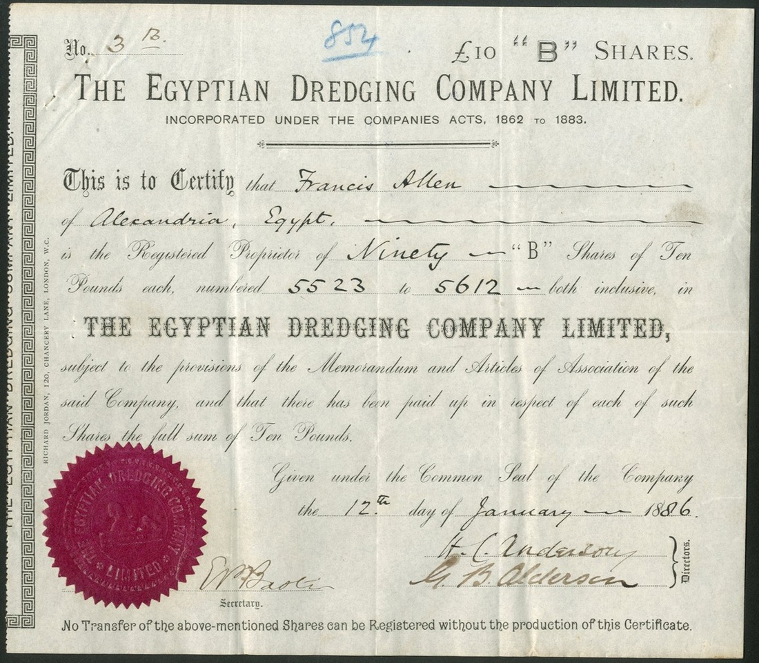 Egypt: Egyptian Dredging Co. Ltd., a pair of certificates of 'B' shares, 18[86], #3B and 'C' shares of £10 each, 18[87], #3, black printing, purple paper seal bottom left on the 'B'. Formed to assist the Government of Egypt to restore and maintain irrigation supplies and drainage canals. By 1908 the company had installed large steam engines at Fadlab to pump water from the Nile. VF (2).