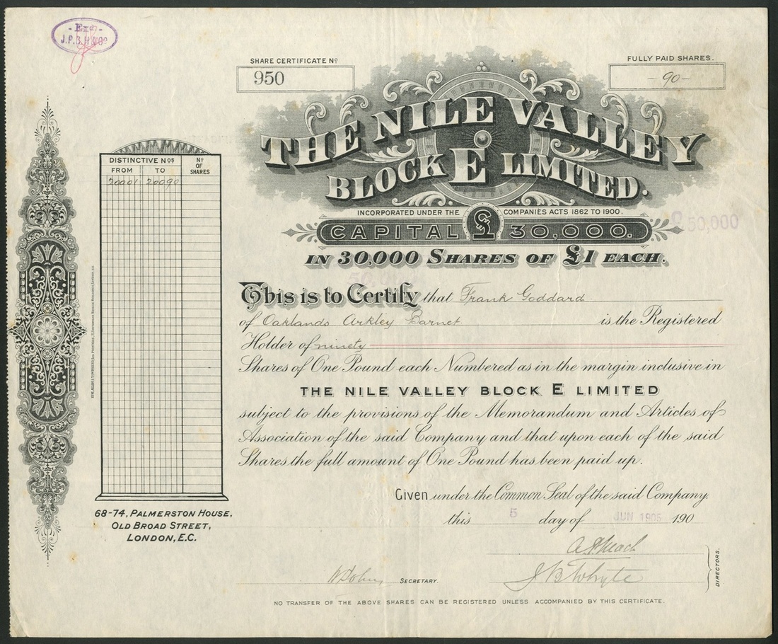 Egypt: Nile Valley Block E Ltd., £1 shares, 190[5], #950, decorative title, black. Mined gold over 25 acres in the Um Garaiat region, and held rights to 30,000 square miles in the Sudan for coal mining. Very slight foxing in places, VF.