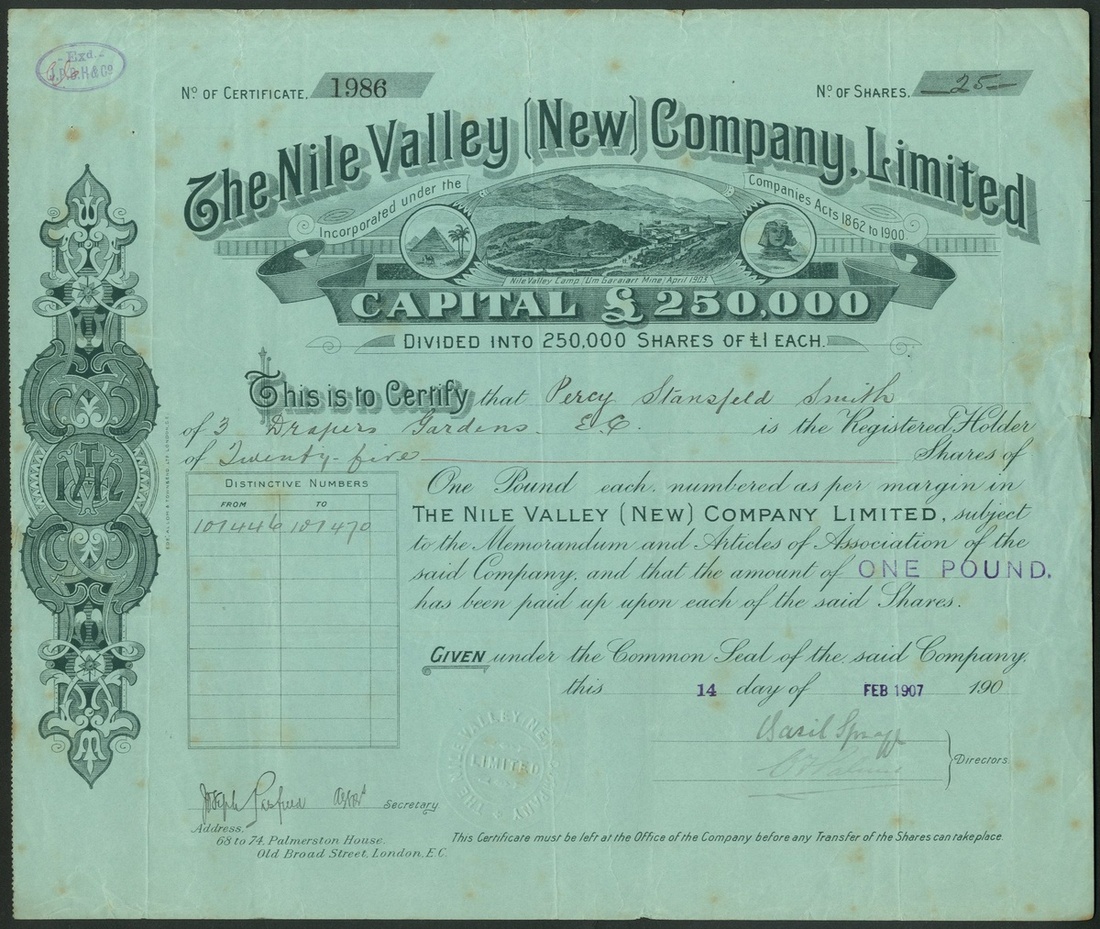 Egypt: Nile Valley (New) Co. Ltd., £1 shares, 190[7], #1986, vignette at top of Um Garaiart Mine with Nile behind, black on green paper. Foxing and some minor edge damage, AVF.