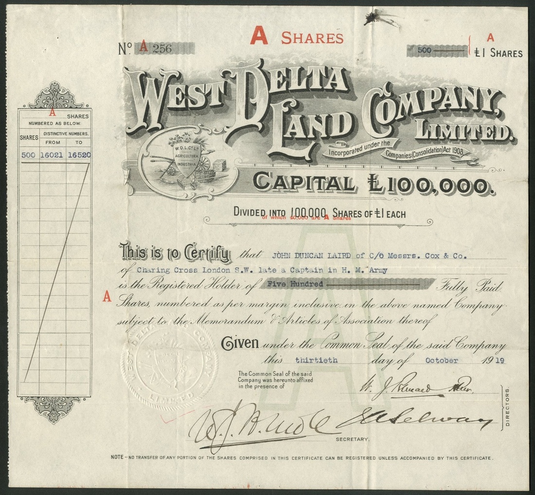 Egypt: West Delta Land Co. Ltd., £1 'A' shares, 19[19], #A256, black printing. Ink stain top right, VF nd rare..