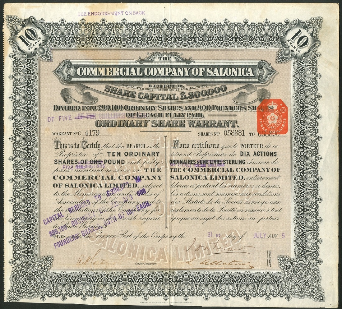 Ottoman Empire: Commercial Company of Salonica Limited, 10 shares of £1, 189[5], #4179, signed by Lazare Allatini as director, ornate border, black, buff underprint, capital reduced by endorsement. The wealthy Allatini family owned a huge industrial complex including brickworks and flour mills in Salonica which still stands but is derelict. They are considered the largest of their type in the orient. The large family house 'Villa Allatini' was built for the family in 1896. It became the refuge for the deposed Sultan in 1909. GVF and rare.