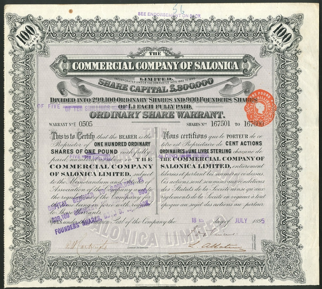 Ottoman Empire: Commercial Company of Salonica Limited, 100 shares of £1, 189[5], #0505, signed by Lazare Allatini as director, ornate border, black, mauve underprint, capital reduced by endorsement. The wealthy Allatini family owned a huge industrial complex including brickworks and flour mills in Salonica which still stands but is derelict. They are considered the largest of their type in the orient. The large family house 'Villa Allatini' was built for the family in 1896. It became the refuge for the deposed Sultan in 1909. GVF and rare.
