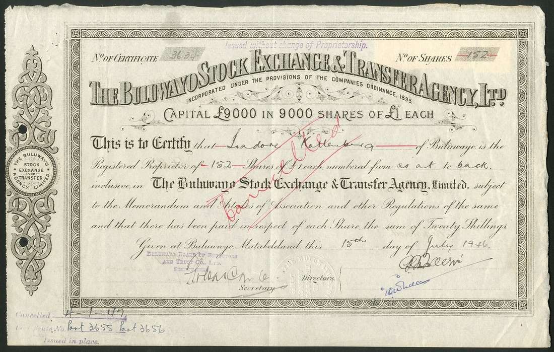 Rhodesia: Buluwayo Stock Exchange & Transfer Agency Ltd., £1 shares, [1946], #3634, ornate border, black, cancelled. The Exchange was originally formed in 1896. According to records the company only lasted 6 years and the modern exchange was only formed in 1946. It would appear however that the company continued throughout the period. GVF and rare.