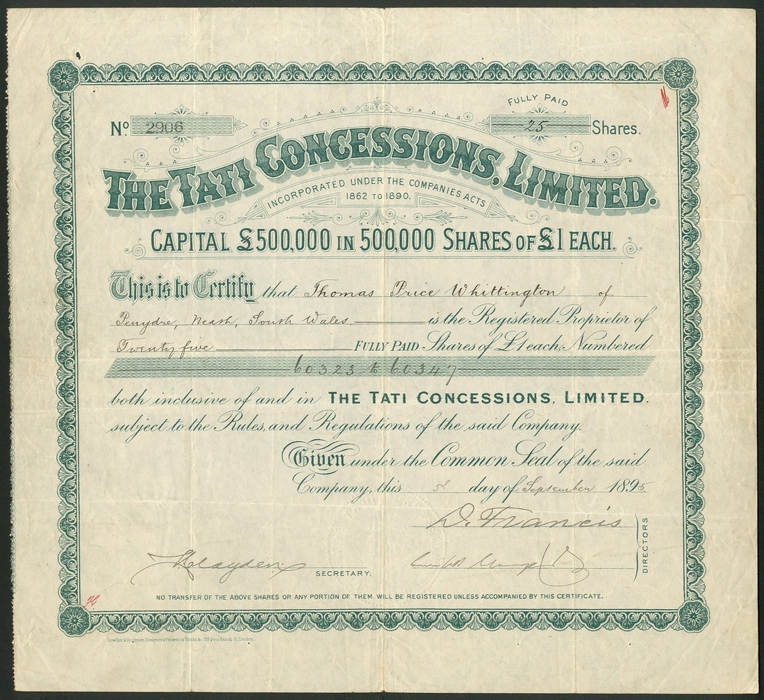 Rhodesia/Bechuanaland: Tati Concessions Ltd., £1 shares, 189[5], #2906, ornate border, green. Previously named the Northern Light Mining Company, which was granted the original concession to the Tati goldfields, historically part of the Matabele kingdom.VF and scarce.