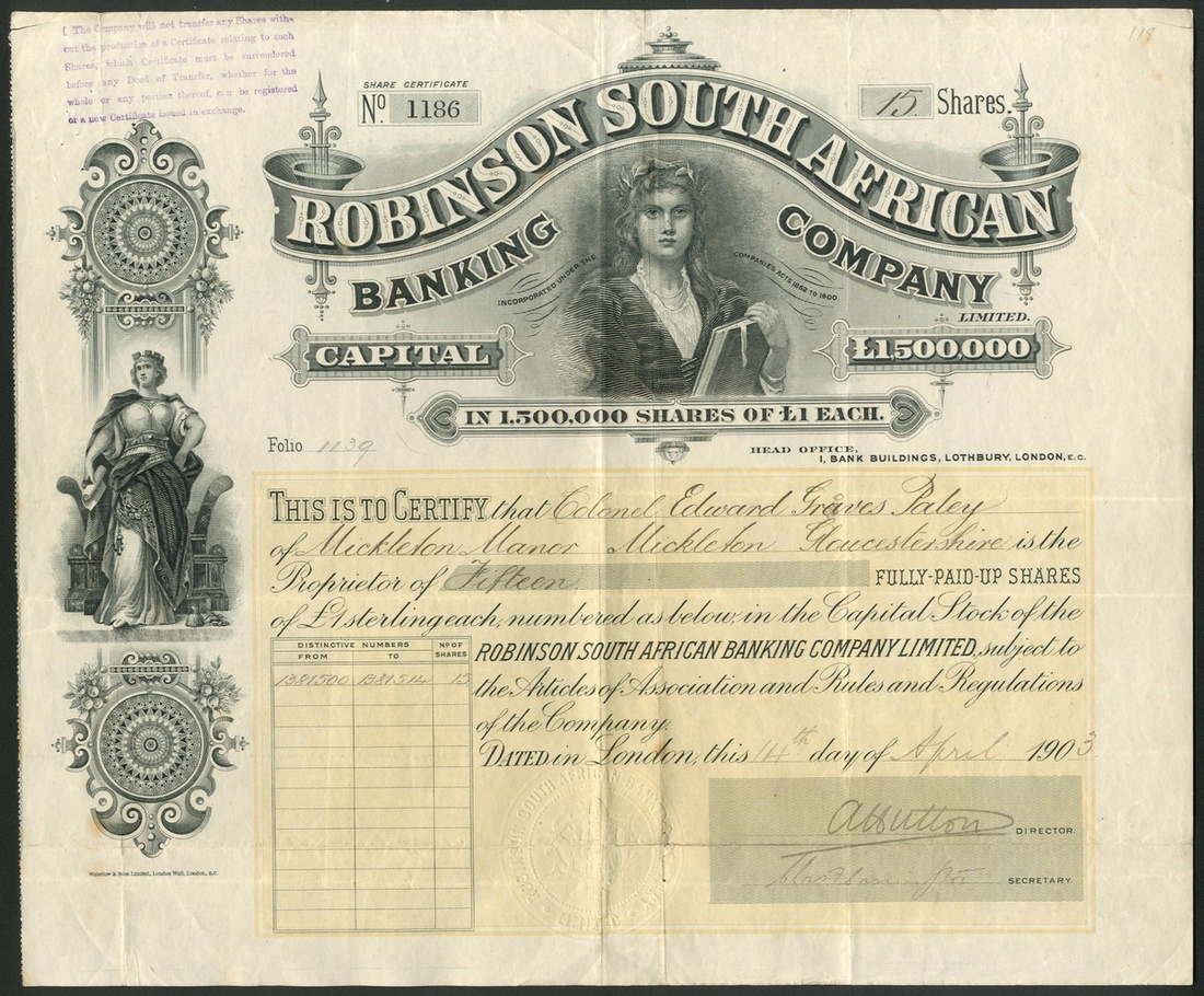 South Africa: Robinson South African Banking Company Ltd., £1 shares, London 190[3], #1186, lovely vignettes of allegorical females, black with yellow underprint, printed by Waterlow & Sons. Organised by gold mining millionaire J.B.Robinson in 1895 and reorganised in 1903 (this company). In liquidation by 1905. This is the scarce earlier example without the 2 lines of inscription in the bottom margin. Two small cuts in top corners, AVF.
