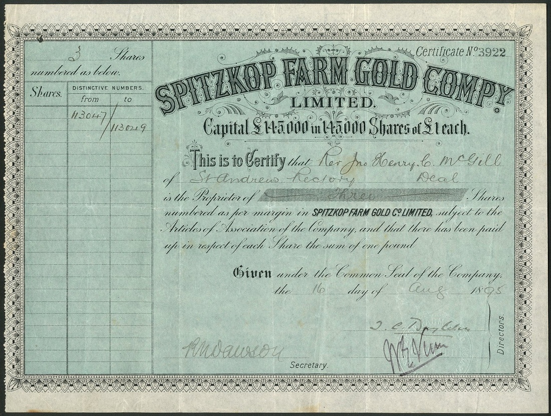 South Africa: Spitzkop Farm Gold Company Limited, £1 shares, 18[95], #3922, black with blue underprint. Mines in the Lydenburg District of the Transvaal. VF but very light stain in centre.