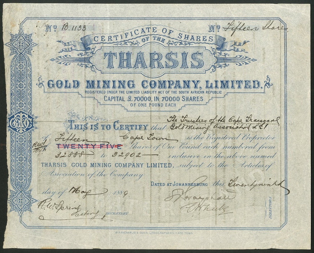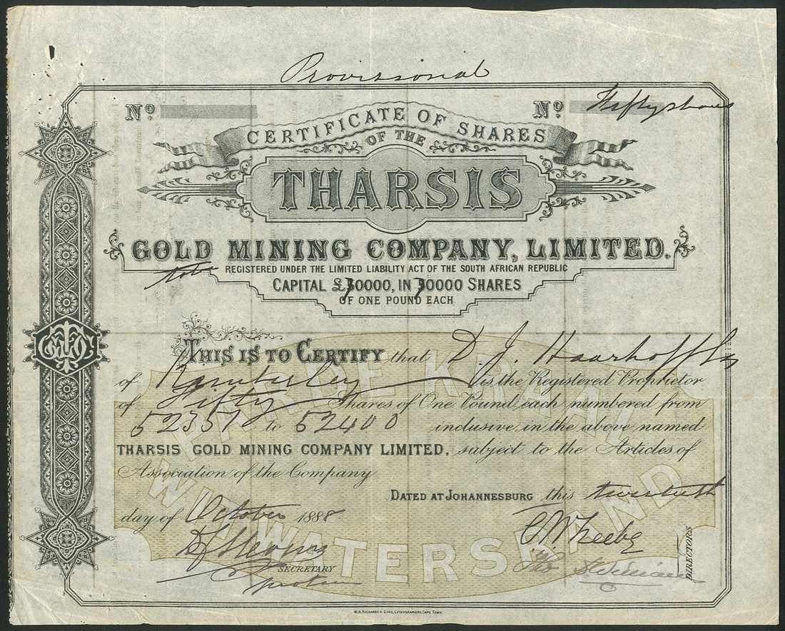 South Africa: Tharsis Gold Mining Company Limited, a pair of certificates for £1 shares, 188[8], black with buff underprint and 188[9], #B1133, blue with buff underprint, showing increased capital. Registered in the South African Republic to acquire the perpetual lease of Mynpacht no. 103, Paardekraal, Witwatersrand. Both VF, the second with uneven left edge (2).