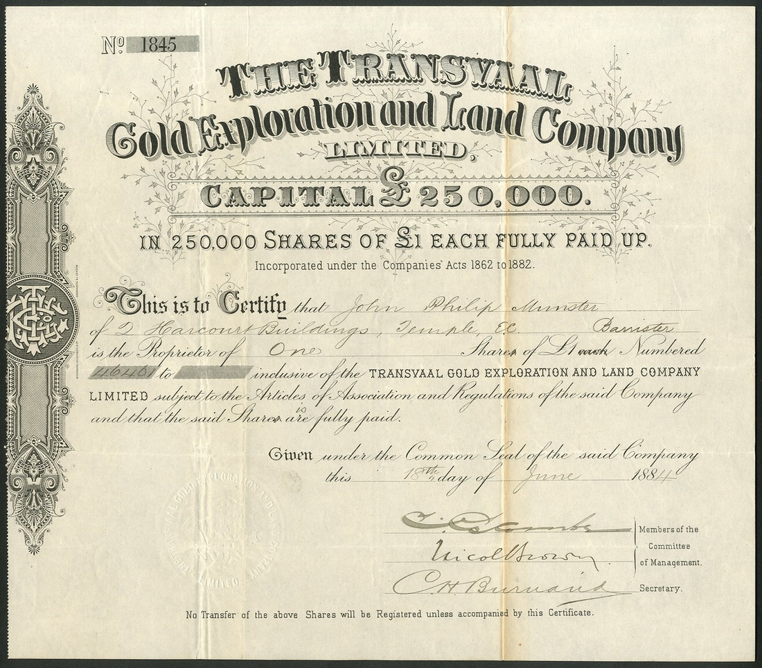 South Africa: Transvaal Gold Exploration and Land Company Limited, £1 shares, 188[4], #1845, black. VF.