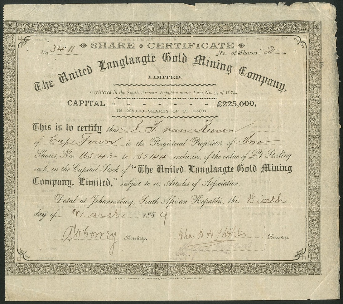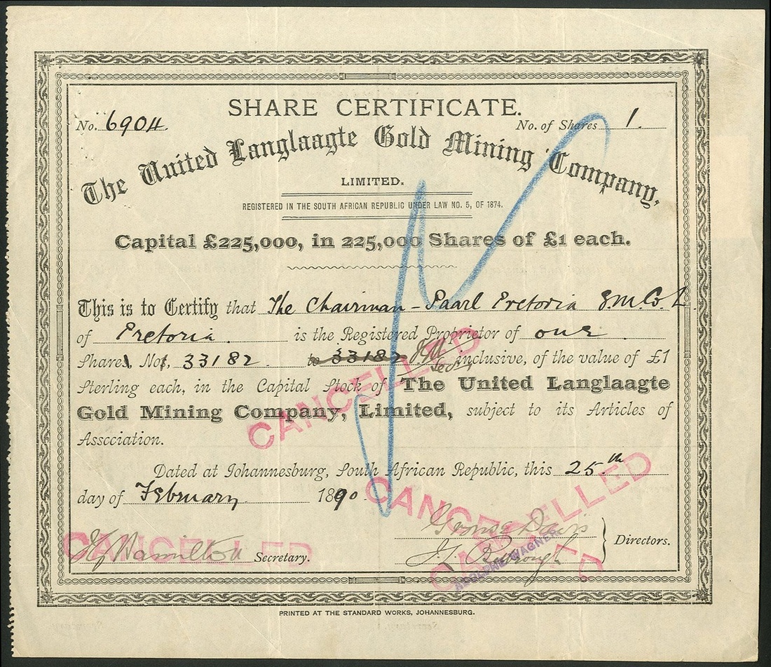 South Africa: United Langlaagte Gold Mining Co. Ltd., pair of certificates for £1 shares, 188[9], #3411, black and 188[90], #6904, text reset, black but cancelled. Both about VF (2).