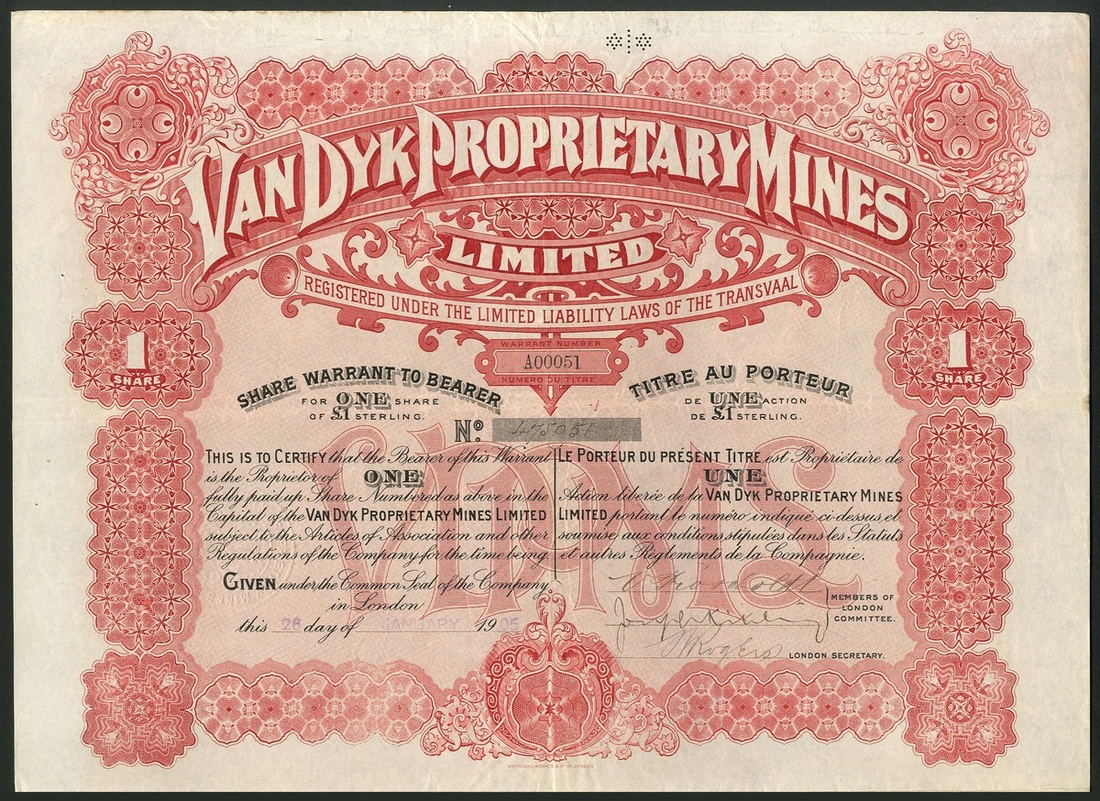 South Africa: Van Dyk Proprietary Mines Limited, 1 share of £1, 19[05], #A00051, ornate design with red border, red underprint, with coupons. VF.