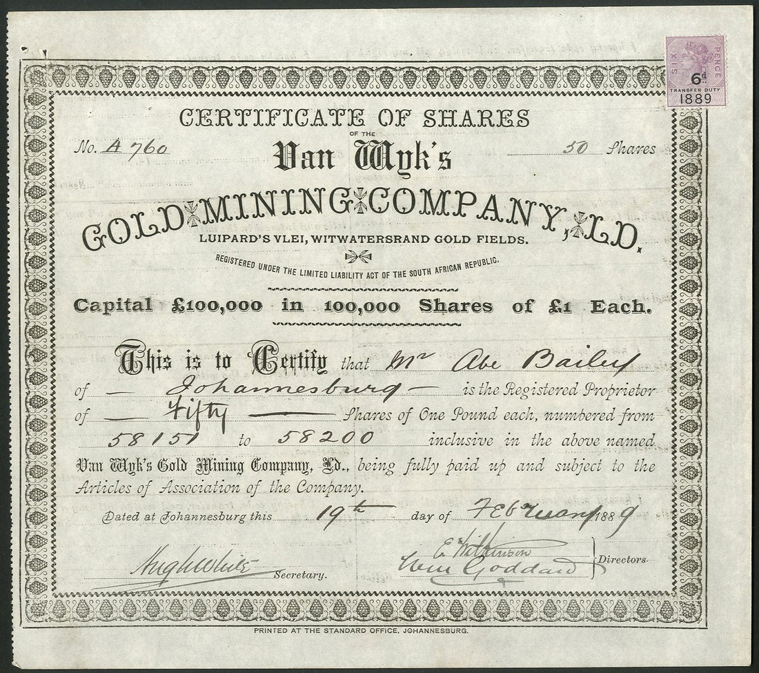South Africa: Van Wyk's Gold Mining Company Limited, £1 shares, 188[9], #A760, issued to and signed by Sir Abe Bailey, ornate border, black. Sir Abe Bailey (1864-1940), diamond magnate and 'Randlord'. Imprisoned after the Jameson Raid but released on payment of a heavy fine. Founded South African Townships, with Julius Jeppe, in Union Parliament 1915-24, created Baronet in 1919. He was to become one of the worlds richest men by the 1930's. The company owned Mines at Luipard's Vlei, Witwatersrand. VF and rare.