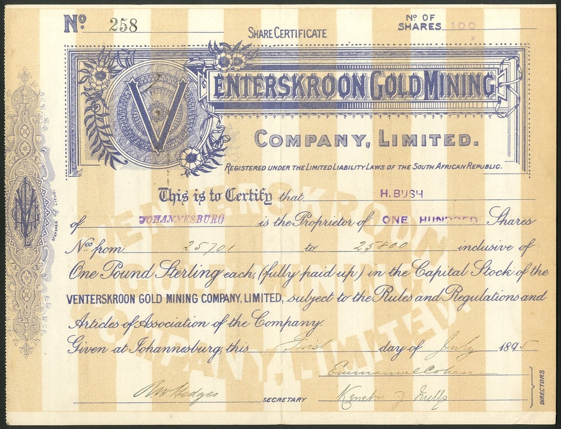 South Africa: Venterskroon Gold Mining Company Limited, £1 shares, 189[5], #258, attractive printing in blue with buff underprint. VF and rare.