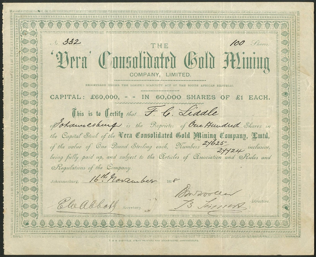South Africa: 'Vera' Consolidated Gold Mining Co. Ltd., £1 shares, Johannesburg 188[8], #332, ornate border, green.