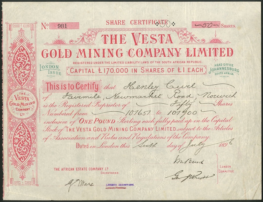 South Africa: Vesta Gold Mining Company Limited, £1 shares, 189[6], #981, attractive red printing with 'London Issue' added in green. VF and first time at auction.