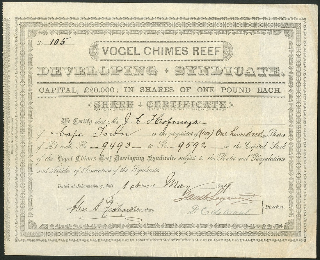 South Africa: Vogel Chimes Reef Developing Syndicate, £1 shares, Johannesburg 188[9], #105, ornate border with attractive silver printing. GVF and rare.