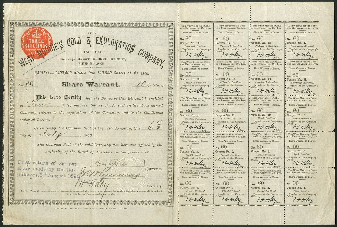 South Africa: West Moodie's Gold & Exploration Co. Ltd., bearer warrant for £1 shares, 1888, #60, black on greyish paper, with coupons. VF and rare.