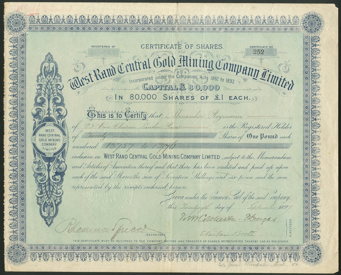 South Africa: West Rand Central Gold Mining Company Limited, £1 shares, 189[7], #252, ornate border, blue, blue underprint. Tip of corner missing otherwise VF and scarce.