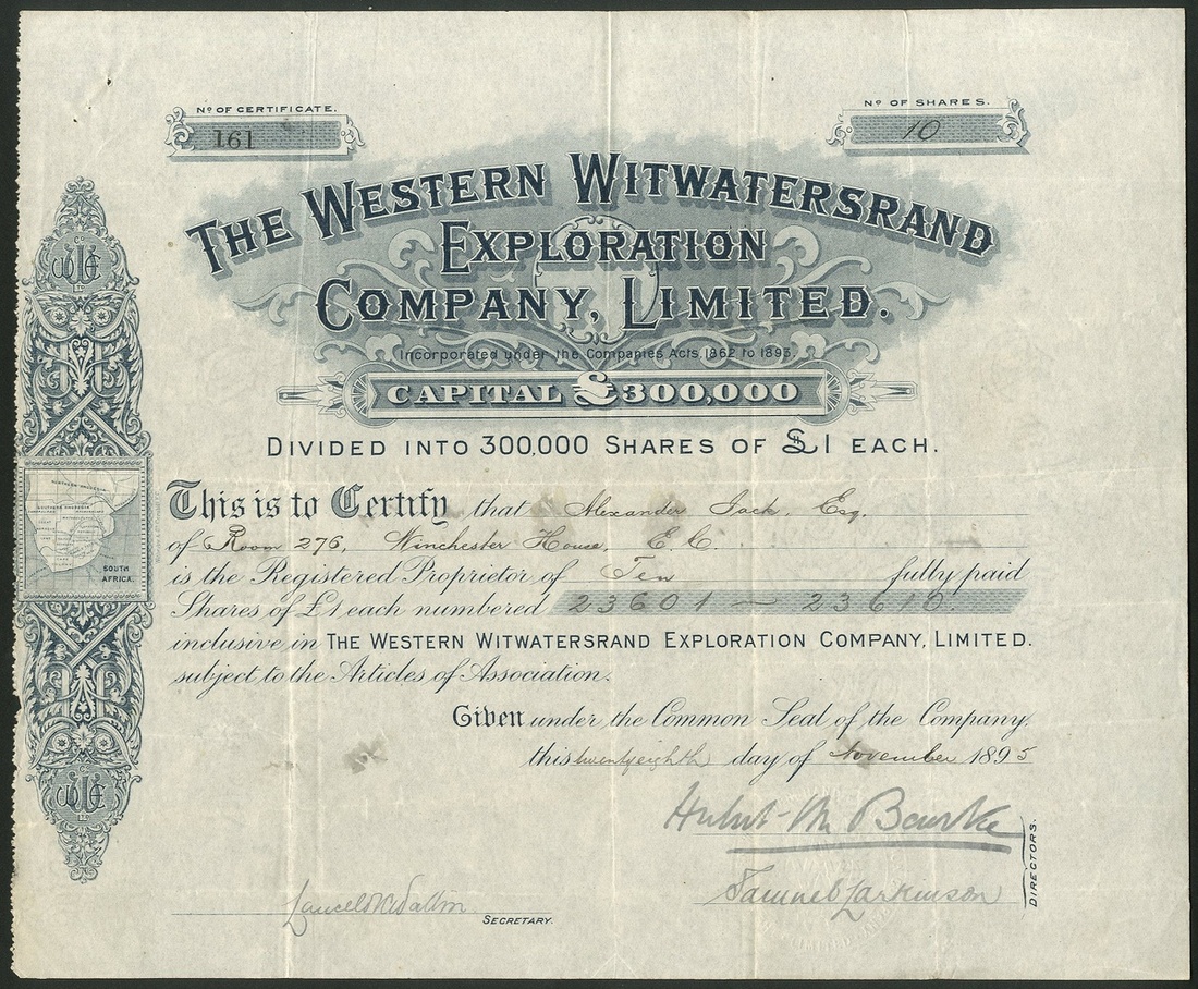 South Africa: Western Witwatersrand Exploration Co. Ltd., £1 shares, 189[5], #161, small map of South Africa in scrollwork, blue. VF and rare.