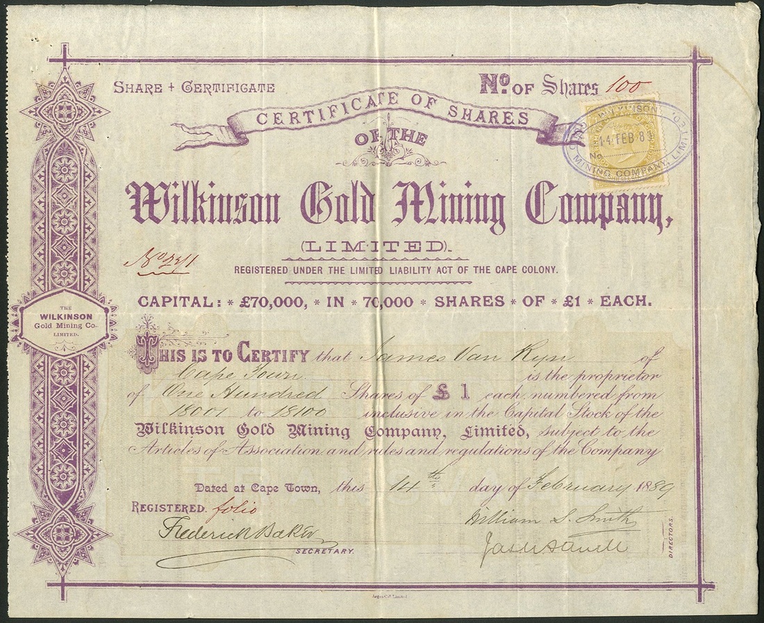 South Africa: Wilkinson Gold Mining Company Limited, £1 shares, 18[89], #271, attractive mauve printing, Cape adhesive revenue stamp. VF.