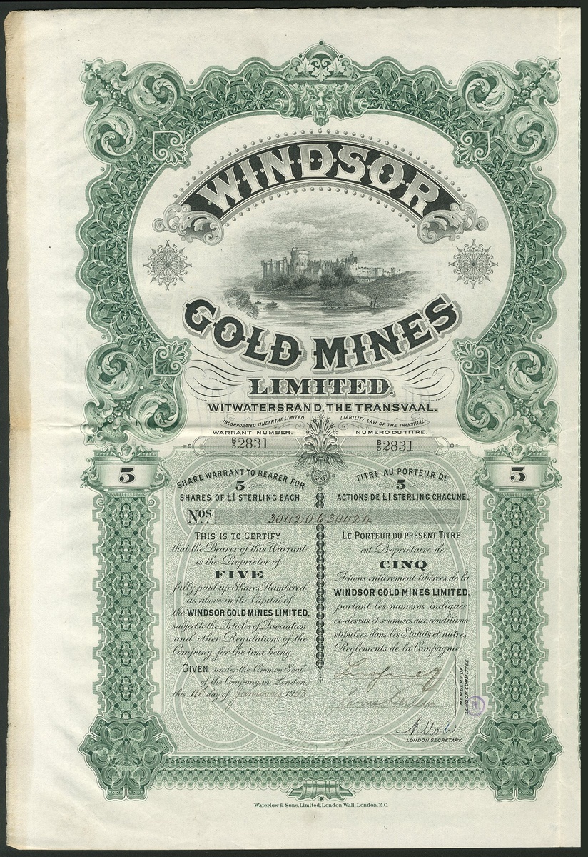 South Africa: Windsor Gold Mines Ltd., bearer warrant for 5 shares of £1, 19[02], #B/5 2831, lovely vignette of Windsor Castle, green and black, printed by Waterlow & Sons, with coupons. GVF and scarce.