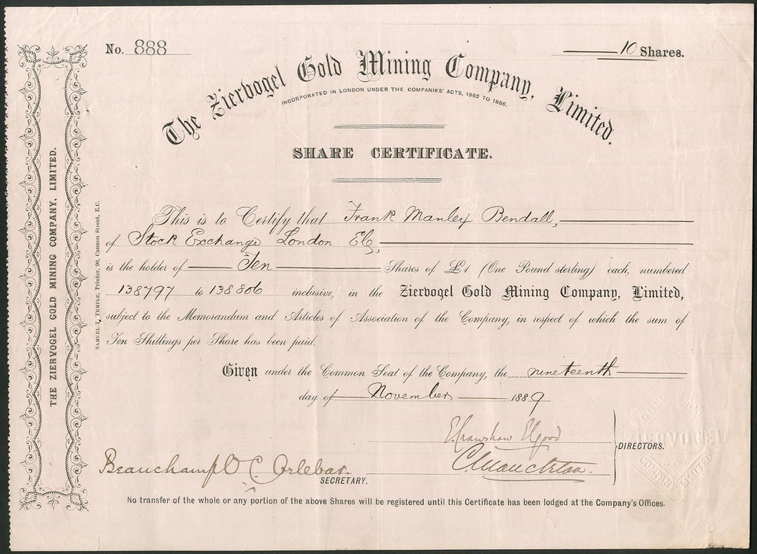 South Africa: Ziervogel Gold Mining Company Limited, £1 shares, 188[9], #888, black on pink paper. VF.